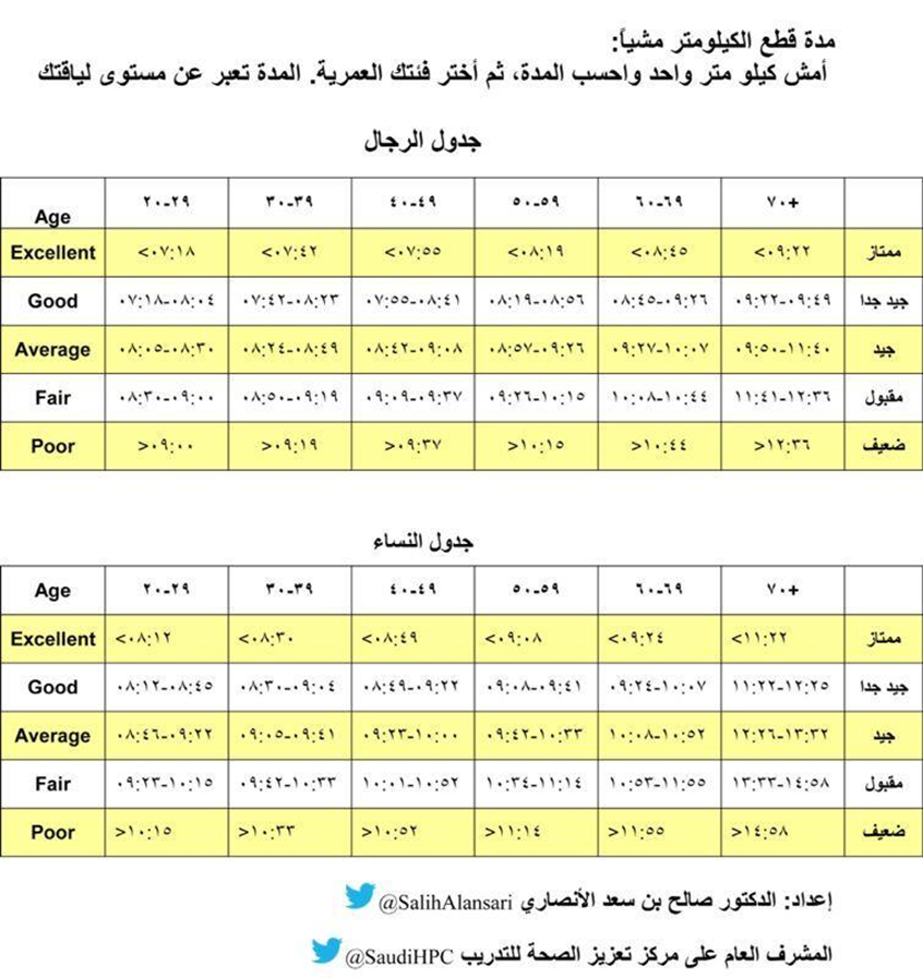 وللاستفادة من الجدول، امش كيلو متراً واحداً واحسب المدة، ثم أختر فئتك العمرية. مدة قطع الكيلومتر بالدقائق والثواني تعبر عن مستوى لياقتك من بين خمس مستويات. ومن خبرتي في التواصل مع محبي الجري ومن يمارسونه بانتظام (ومعظمهم من الشباب) ألاحظ أن بعضهم لم يجربوا أو لا يحبون المشي السريع، ومنهم من قال لي: أنا أتعب من المشي السريع أكثر مما يتعبني الجري، وهذه حقيقة علمية، تفسيرها أنه وحتى سرعة معينة يكون المشي السريع أكثر إجهاداً من الجري، لأن الوزن أثناء المشي يكون محمولاً على أحد الساقين طوال الوقت. أما الجري فيوفر فترات "راحة" تستمر جزءاً من الثانية بسبب تأثير النط (القفز) (Trotting effect)، وهذه "الراحة" لا تتوفر في المشي السريع. ومن هنا أقول: مؤيدو الجري لم يجربوا المشي السريع. وهم ينتقلون من المشي البطيء إلى الجري دون تجربة المشي السريع. ومن هنا أدعوهم إلى تجربة المشي السريع، وهنا أتذكر قوله صلى الله عليه وسلم مرة أخرى عليكم بالنسلان. ودمتم سالمين.